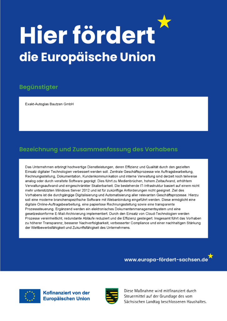 Die Exakt-Autoglas Bautzen GmbH wurde im Jahr 2003 gegründet und blickt somit auf eine über 20-jährige Tradition zurück. Unsere Mitarbeiter sind die absoluten Spezialisten auf ihrem Gebiet.